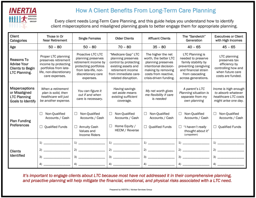 Review the framework below to evaluate how each client’s situation aligns with these planning realities, then use the insights to prioritize next steps. Once you’ve completed your review, contact us to discuss observations, gaps, and proven strategies for integrating Long-Term Care Planning into your existing client process.