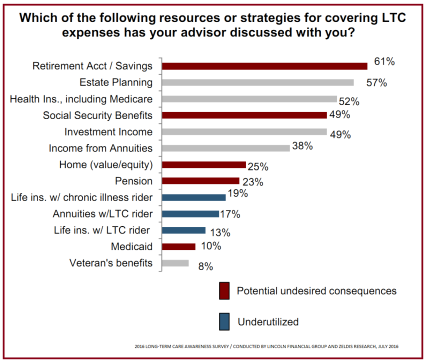 Now consider the fairly consistent survey data - this one from Lincoln Financial Group - indicating less than 50% of consumers have discussed LTC planning with their advisor, and less than 30% of all those individuals have implemented a planning solution to mitigate the risk associated with future LTC needs.